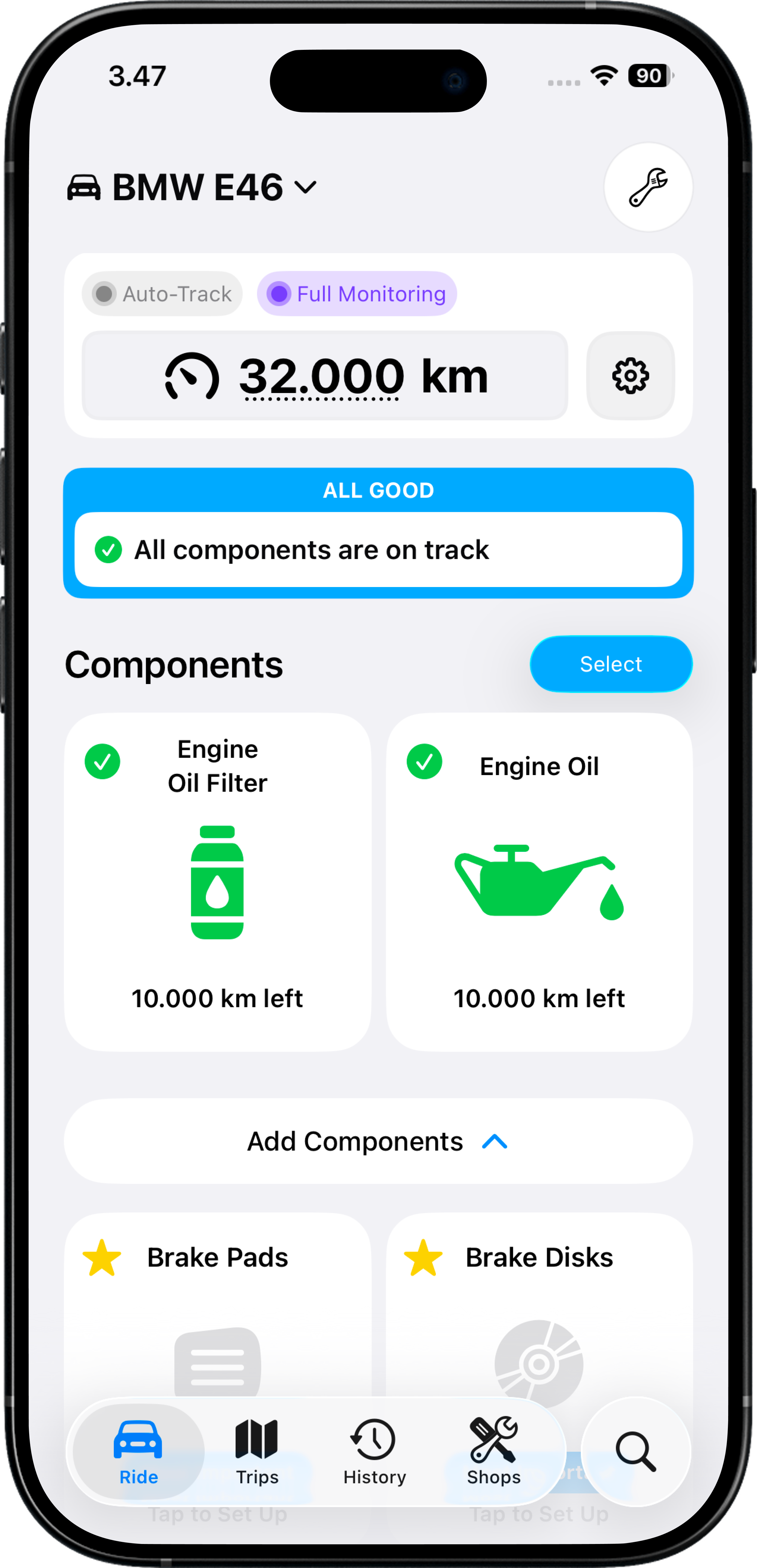 RideCheck helps you monitor your vehicle's condition and reminds you when important components need service. From engine oil and tires to the battery β everything is tracked and predicted based on mileage and time.